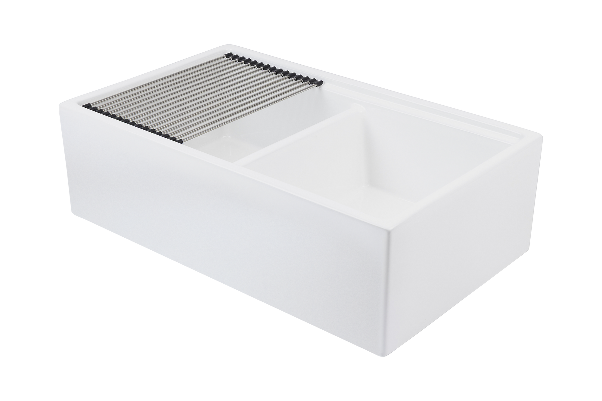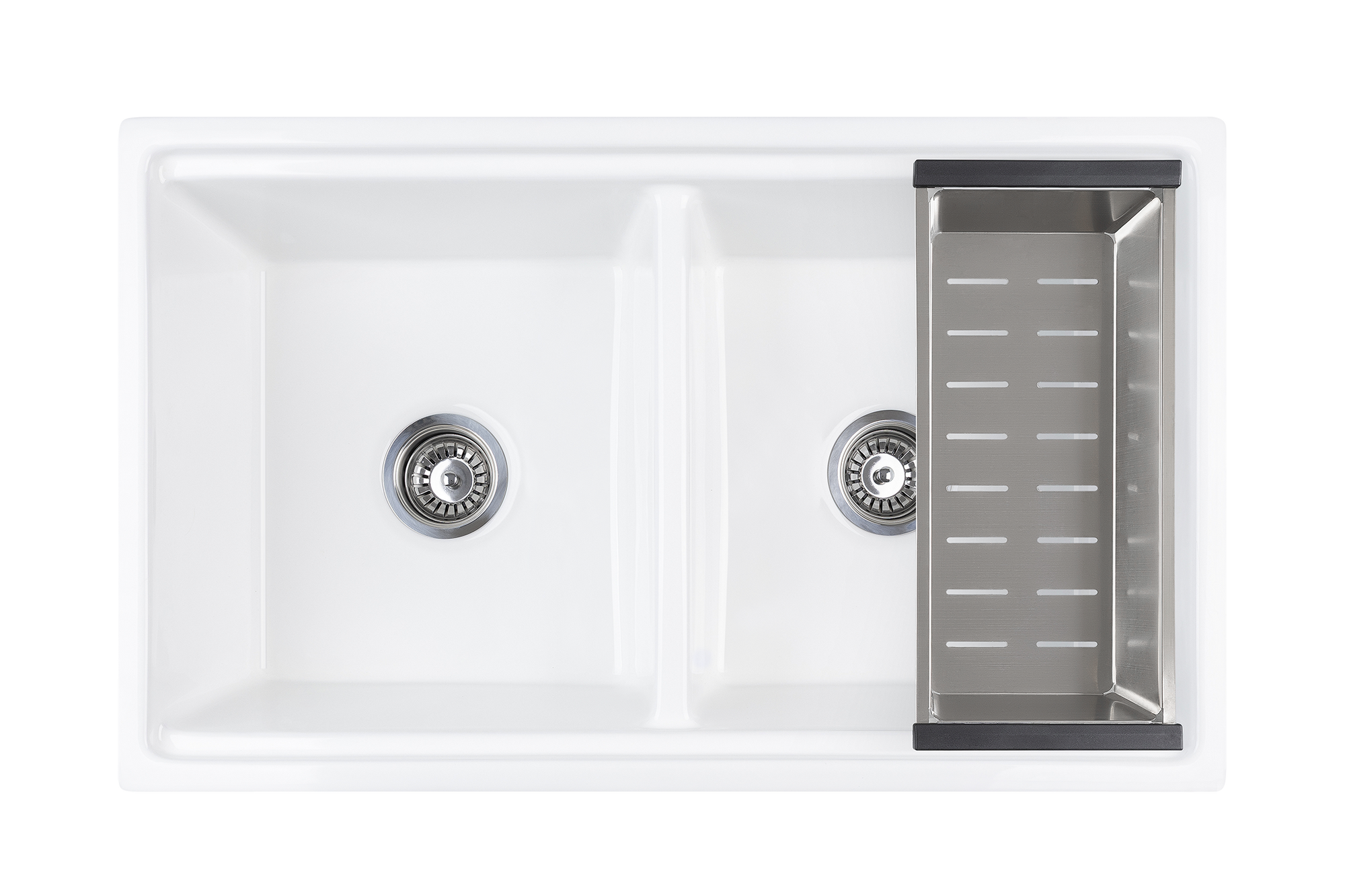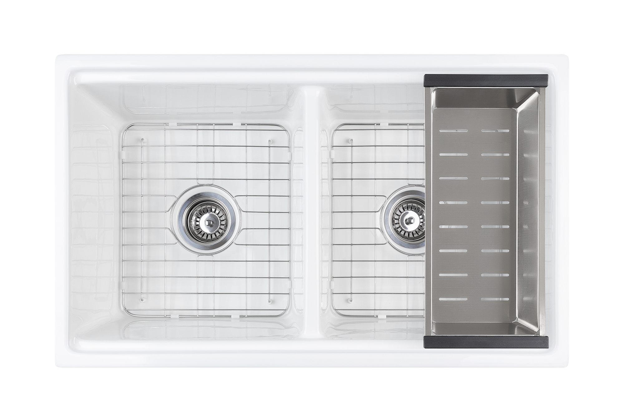 The ultimate double bowl farmhouse sink. Manufactured from UK Fireclay, complete with chopping/prep board, internal grid, grill, colander, chrome waste and plug.