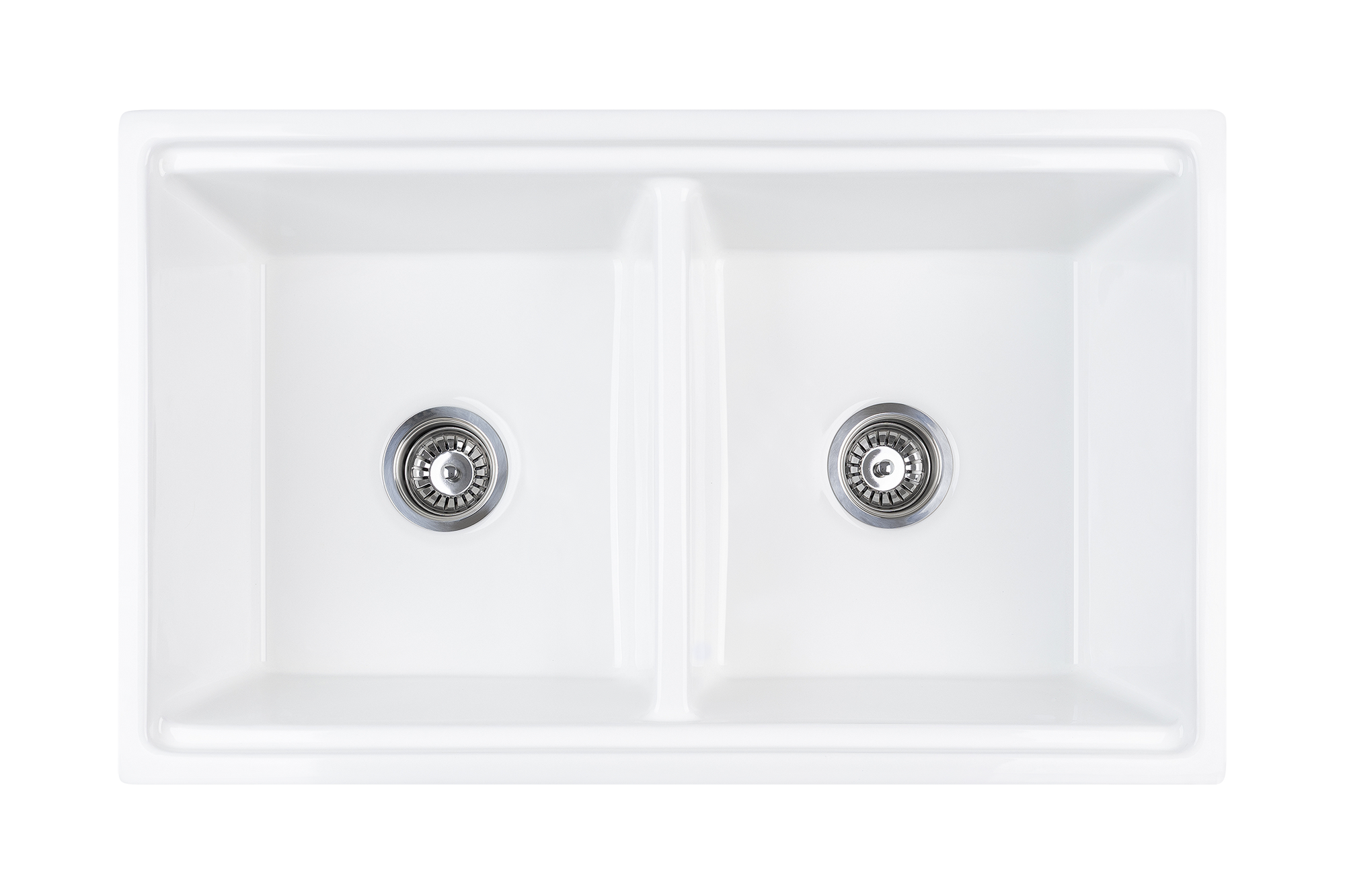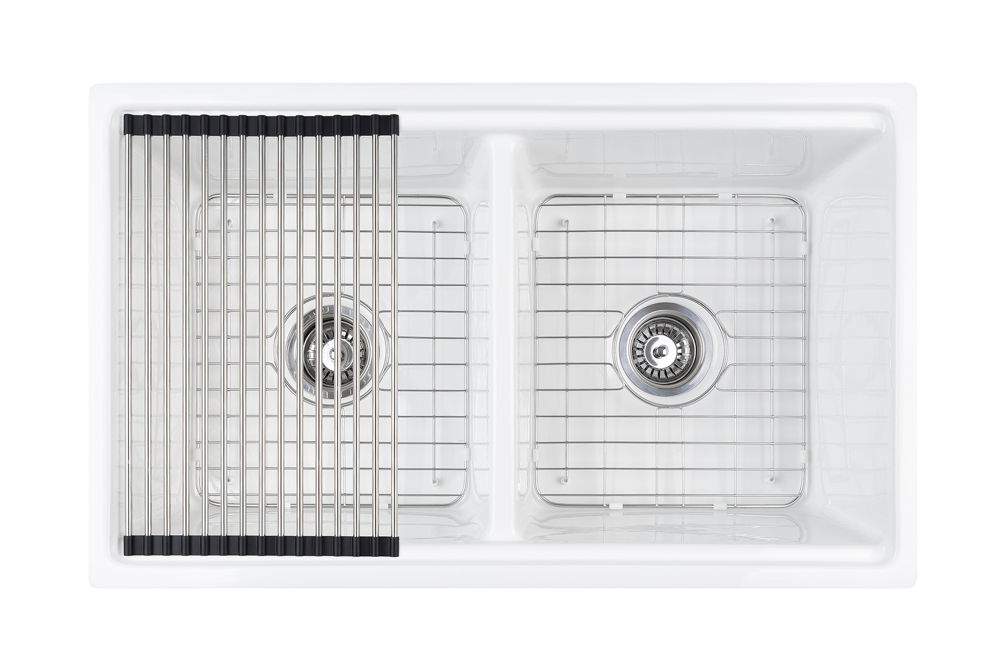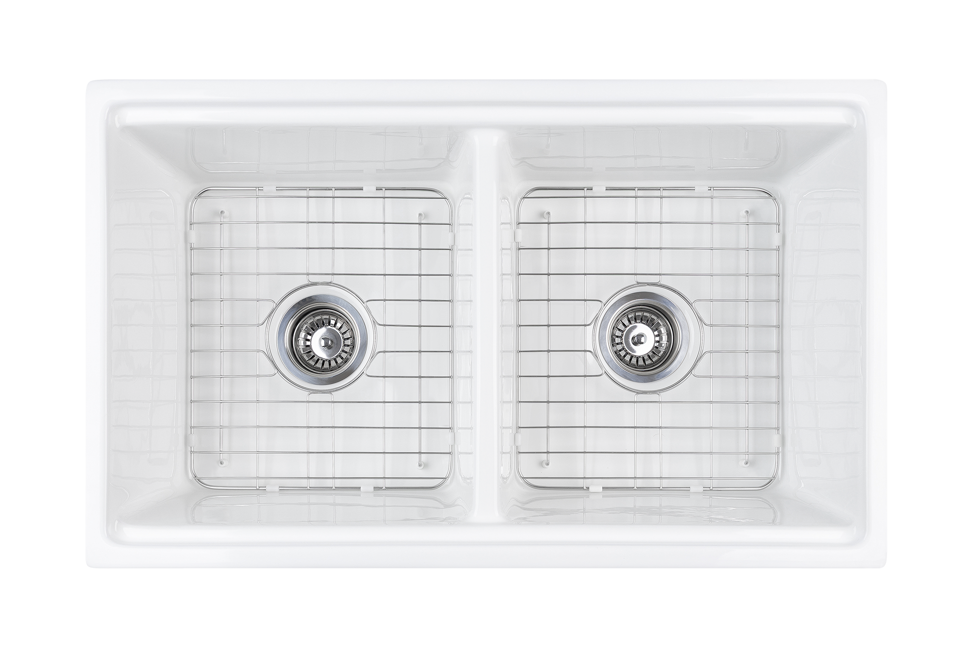 The ultimate double bowl farmhouse sink. Manufactured from UK Fireclay, complete with chopping/prep board, internal grid, grill, colander, chrome waste and plug.