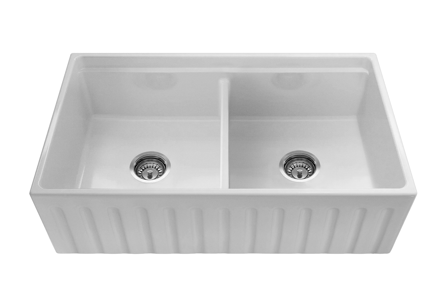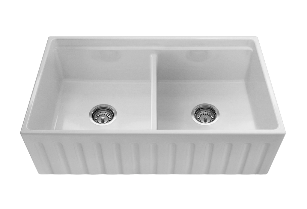 The ultimate double bowl farmhouse sink. Manufactured from UK fireclay, complete with chopping/prep board, internal grid, grill, colander, chrome waste and plug.